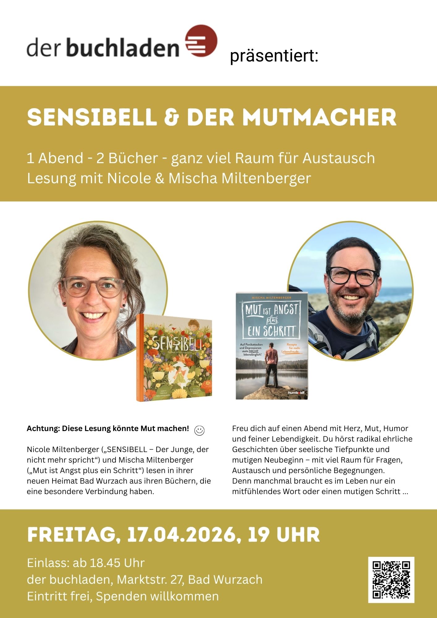 Nicole Miltenberger („SENSIBELL – Der Junge, der nicht mehr spricht“) und Mischa Miltenberger („Mut ist Angst plus ein Schritt“) lesen in ihrer neuen Heimat Bad Wurzach aus ihren Büchern – zwei Geschichten, die auf besondere Weise miteinander verbunden sind.